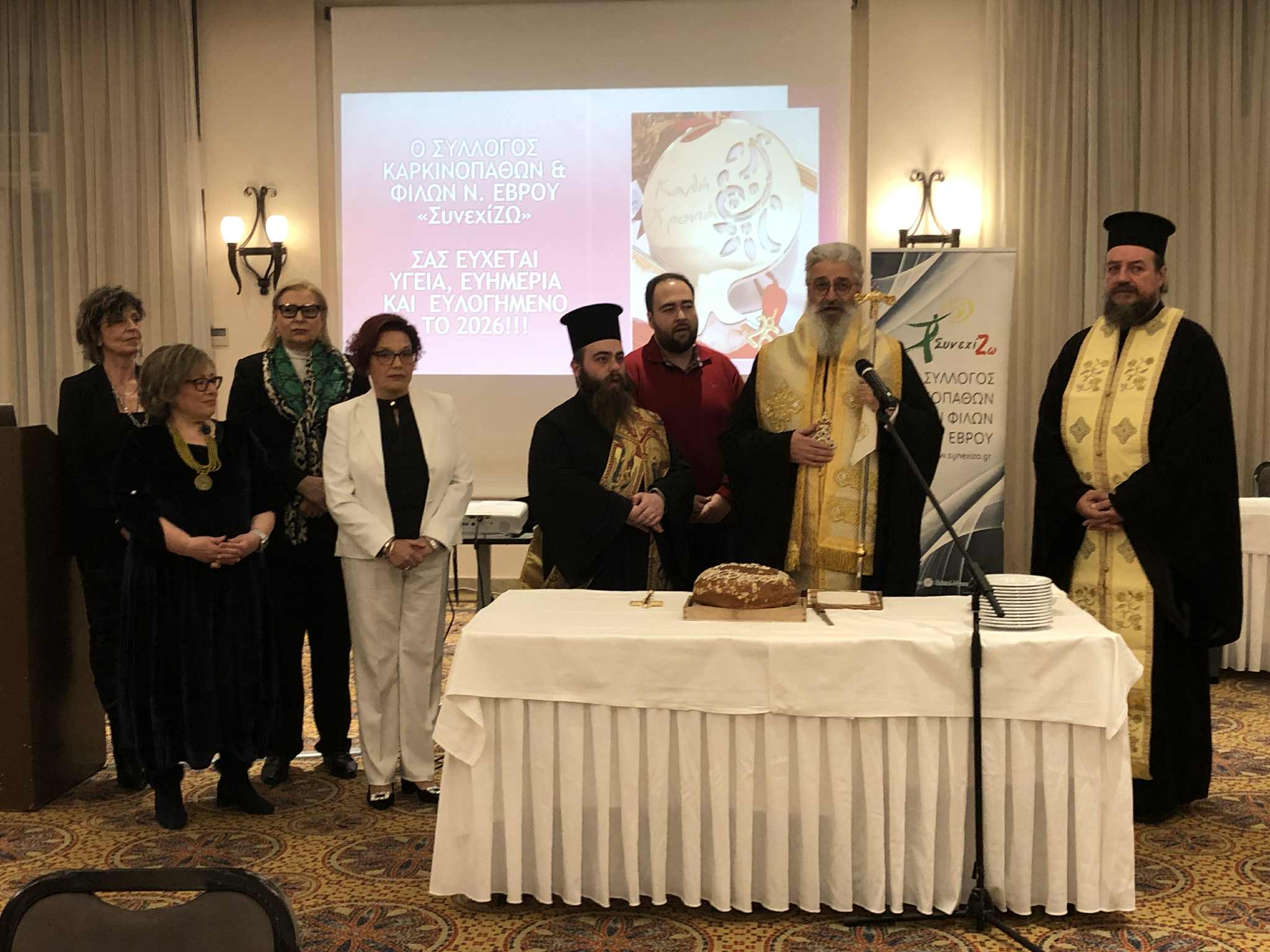 Ο Σύλλογος Καρκινοπαθών και Φίλων Ν. Έβρου Συνεχίζω πραγματοποίησε με συγκίνηση και χαρά την καθιερωμένη κοπή της βασιλόπιτάς του, σε ένα ζεστό και ανθρώπινο κλίμα, γεμάτο ελπίδα, αγάπη και αλληλεγγύη. Την βασιλόπιτα ευλόγησε ο Μητροπολίτης μας κ Άνθιμος, ο οποίος στην σύντομη προσφώνηση του ευχαρίστησε την πρόεδρο και όλα τα μέλη του συλλόγου που μας δίνουν την ευκαιρία να συνειδητοποιήσουμε