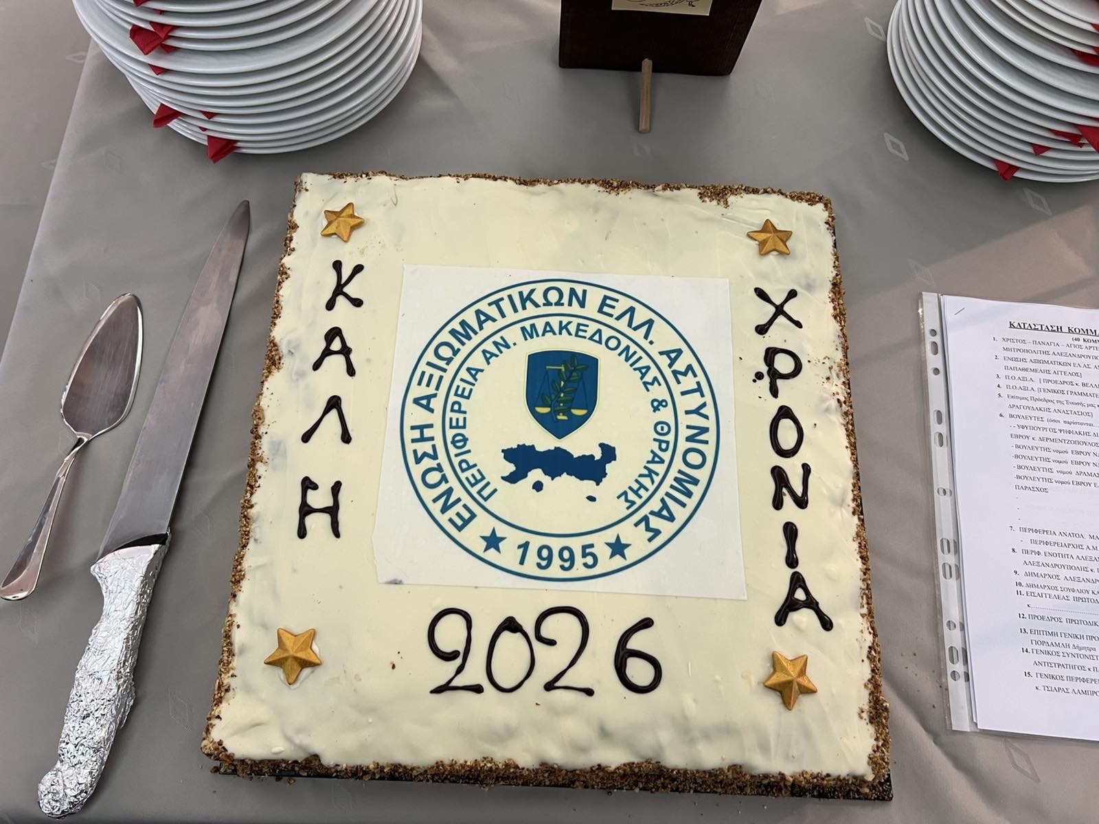 Το μεσημέρι της Κυριακης 11 Ιανουαρίου 2026 πραγματοποιήθηκε η κοπή της βασιλόπιτας της Ένωσης Αξιωματικών Ελληνικής Αστυνομίας Ανατολικής Μακεδονίας και Θράκης, με τη συμμετοχή εκπροσώπων της πολιτείας, της τοπικής αυτοδιοίκησης και της ηγεσίας του Σώματος.